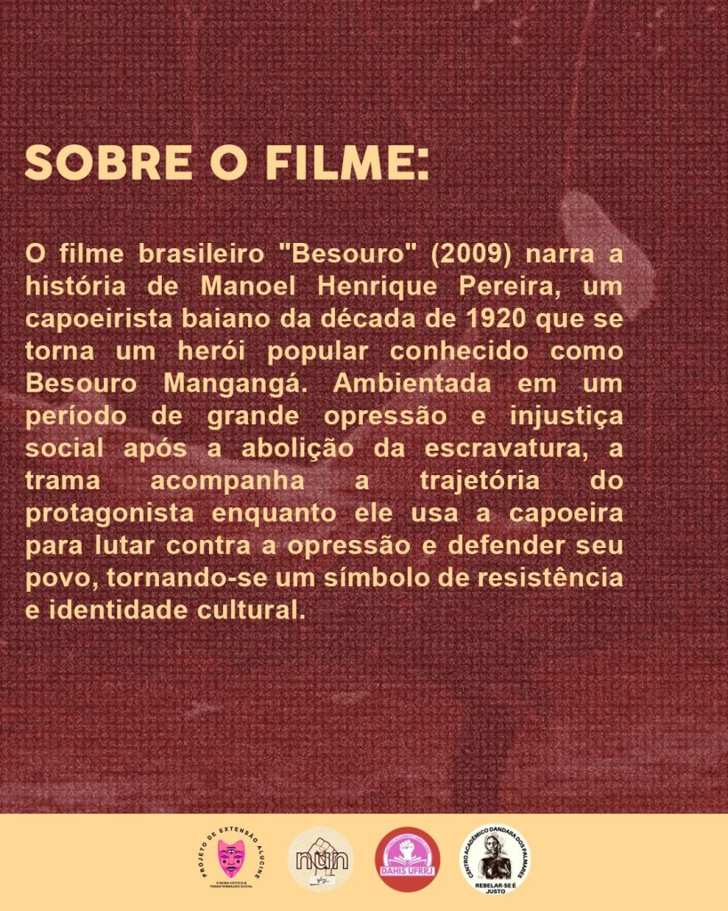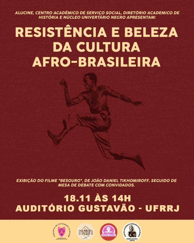 O Centro Acadêmico de Serviço Social, em sua nova gestão, realizará no dia 18/11 (terça-feira) uma atividade em celebração ao Novembro Negro, em parceria com o AluCine – Cineclube de Serviço Social. O evento contará com a exibição do filme Besouro de João Daniel Tikhomiroff , seguida de debate mediado pela Prof.ª Suelen, com participação de estudantes indicados pelo Diretório Acadêmico de História e pelo Núcleo Universitário Negro.