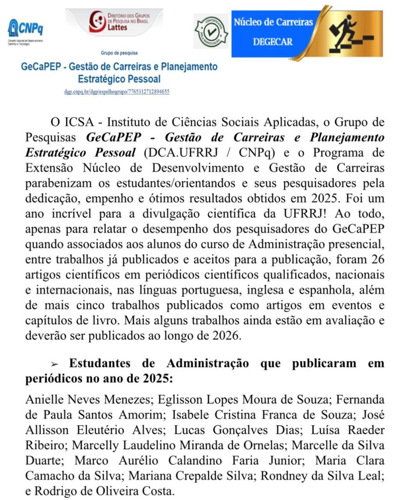 Produção científica discente em evidência: 2025 consolida o protagonismo dos estudantes de Administração da UFRRJ em publicações nacionais e internacionais!